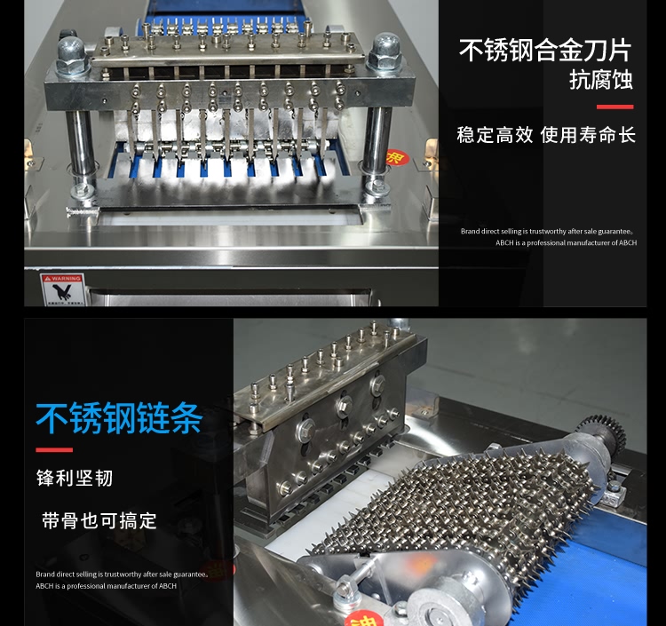 艾博馳ABCH-13A禽肉類剁塊機適合禽類,魚類的剁塊,剁段需求,輸送裝置采用單片食品級PE材質(zhì)膠板設(shè)計,可單片更換,非常方便,壓料輸送裝置采用針式鏈條設(shè)計,有效防止物料打滑后退或輸送不均勻等弊端。丁刀組丁刀刀距寬度可定制規(guī)格(2cm、2.5cm、3cm、3.5cm)等,標配3CM,最小2cm,實際成品小于丁刀刀距0.2cm,長短1cm-5cm可調(diào),物料需冷凍,效果更佳!