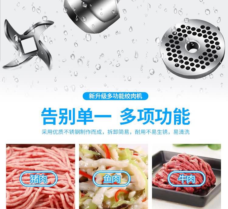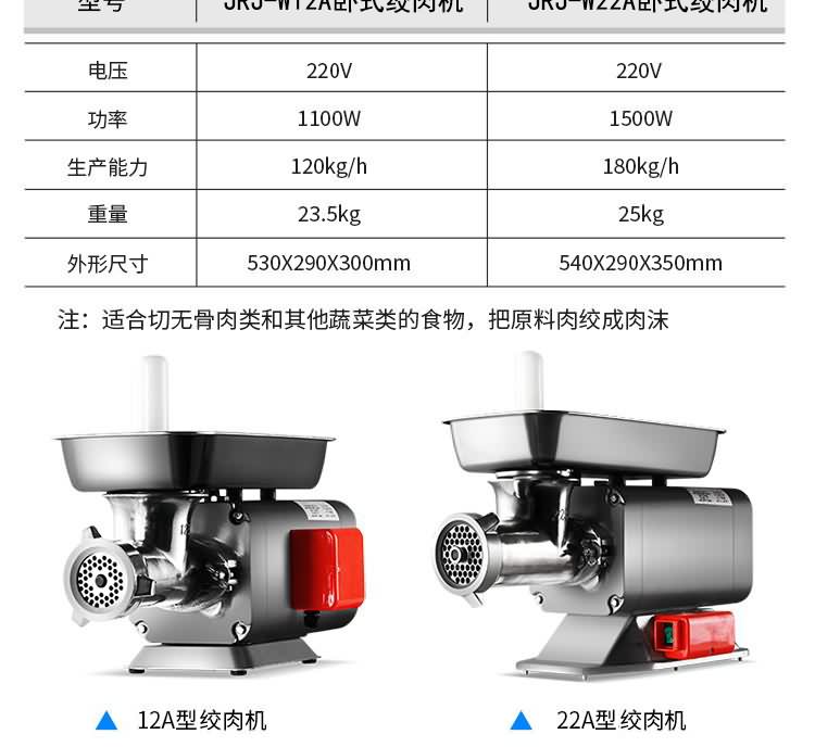 艾博馳ABCH-W12A/22A臥式絞肉機(可絞-5度左右凍肉,防水開關(guān),1.5毫米加厚不銹鋼機身邊.緣鈍化處理不傷手,4CR13不銹鋼強勁刀組,耐受力是普通刀片5倍.10公分大口徑入口,國標(biāo)同芯電機,保修一年,贈送原裝十字刀,孔板,搗肉棒,灌腸喇叭口各一個,標(biāo)配絞肉網(wǎng)板6和8毫米。