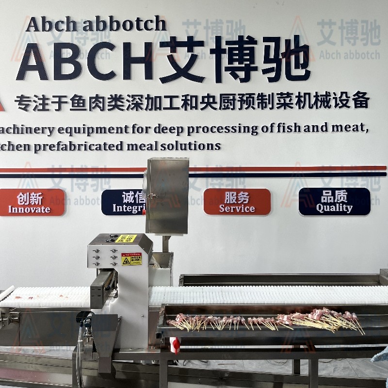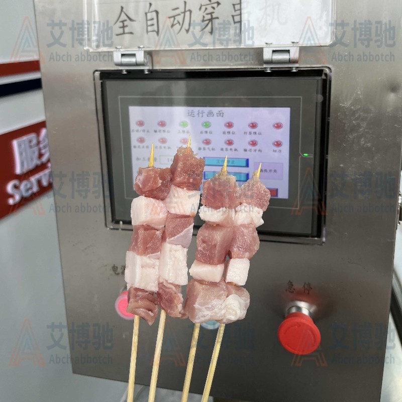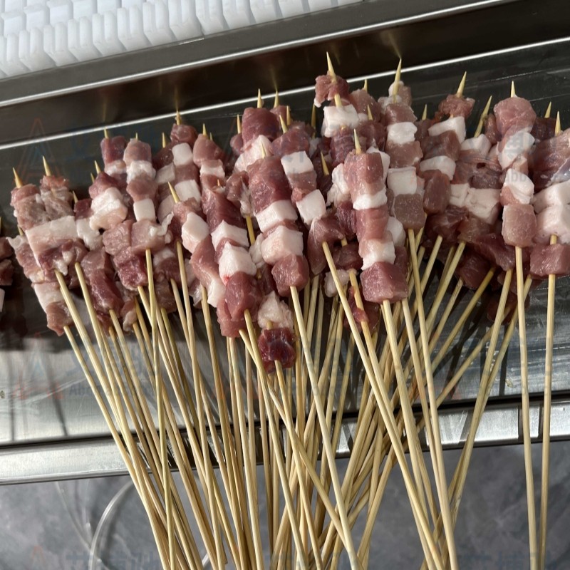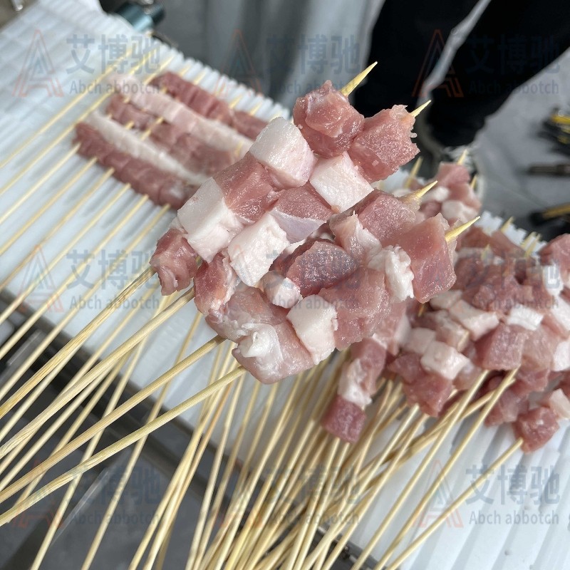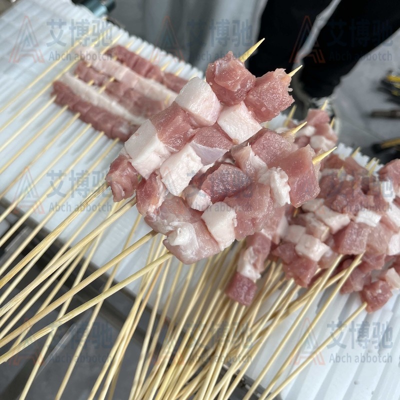 ABCH穿串機(jī)新款機(jī)器廠家現(xiàn)場(chǎng)試機(jī)串豬肉串,效果非常不錯(cuò)