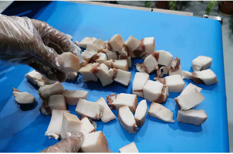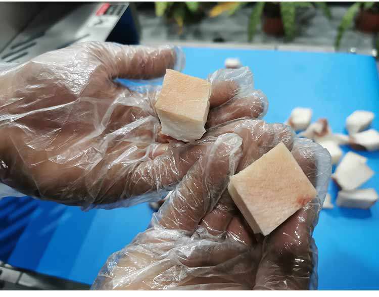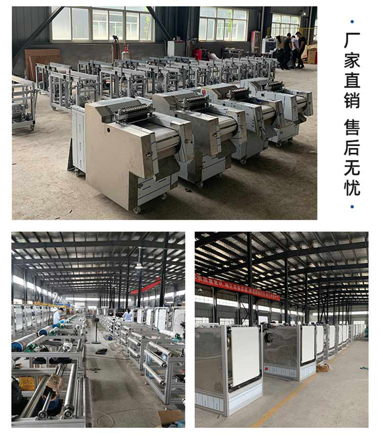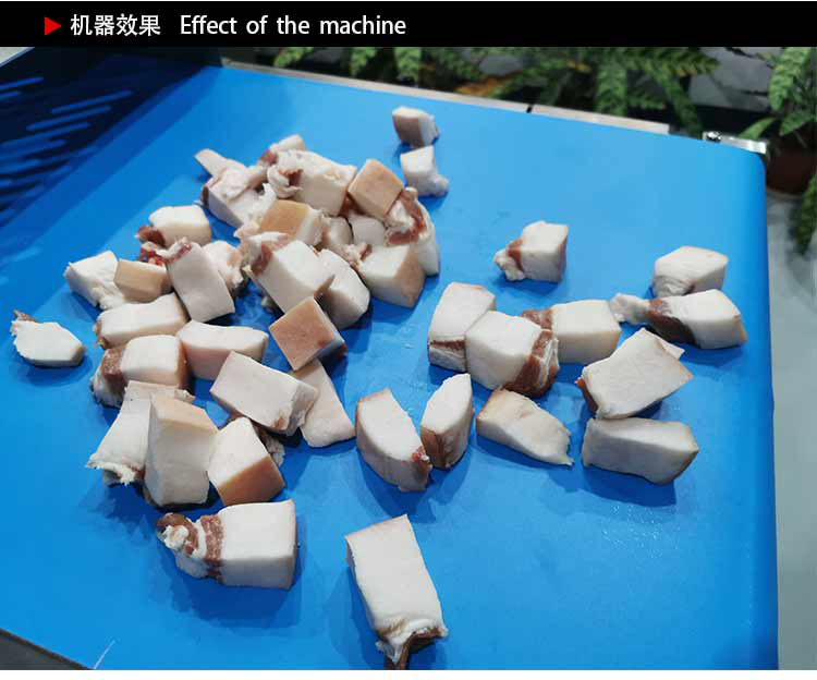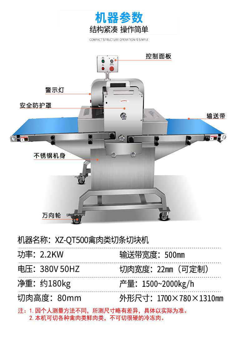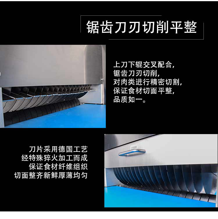 采用優(yōu)質(zhì)不銹鋼整體機(jī)身設(shè)計(jì),強(qiáng)度高,無污染,符合食品安全生產(chǎn)規(guī)范 表面經(jīng)過深度拋光和噴砂處理,外表光滑,易于清理 上刀下輥交叉配合,鋸齒刀刃切削,對肉類進(jìn)行精密切割, 保證食材切面平整,品質(zhì)如一。 安全開關(guān),可有效地保護(hù)使用者的安全。 懸臂式刀組,可輕易拆卸、清洗,不同規(guī)格的刀組更換便捷。 工作效率高,產(chǎn)量大。 速度快,效率高。 1500W 減速電機(jī)電機(jī),易啟動(dòng),扭矩大,切削輕快,更省電。 拆卸組裝容易,易于清理。 適用于各種禽肉類切條切塊。