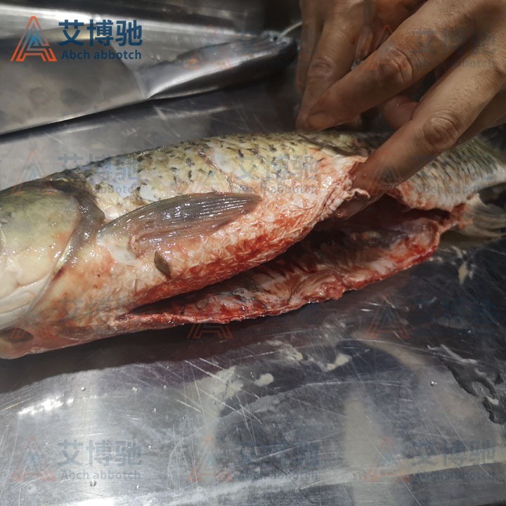 經(jīng)過艾博馳艾博馳ABCH-28全自動殺魚機(jī)的加工,可以看得出來表面魚鱗基本上去的很干凈