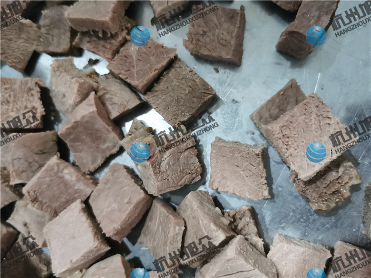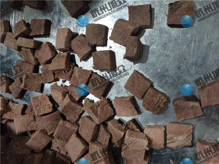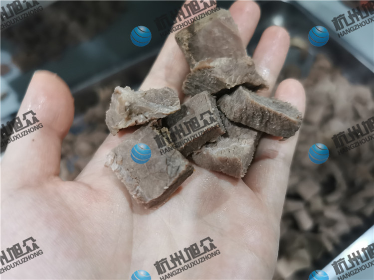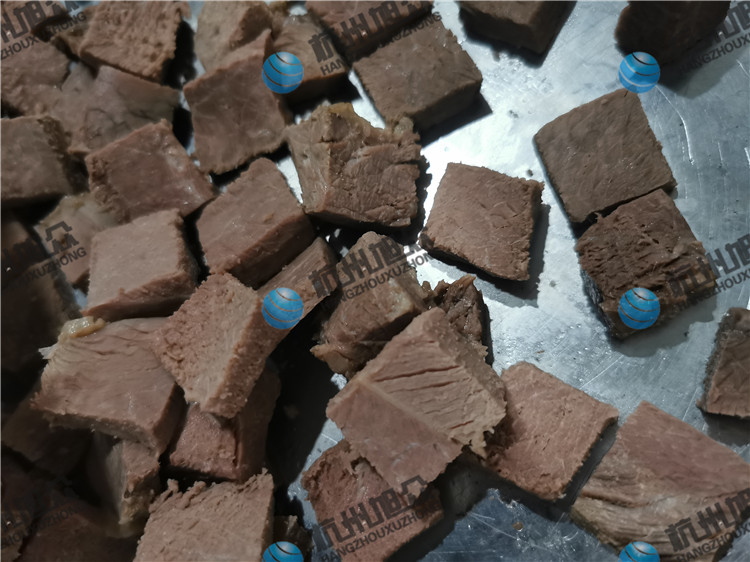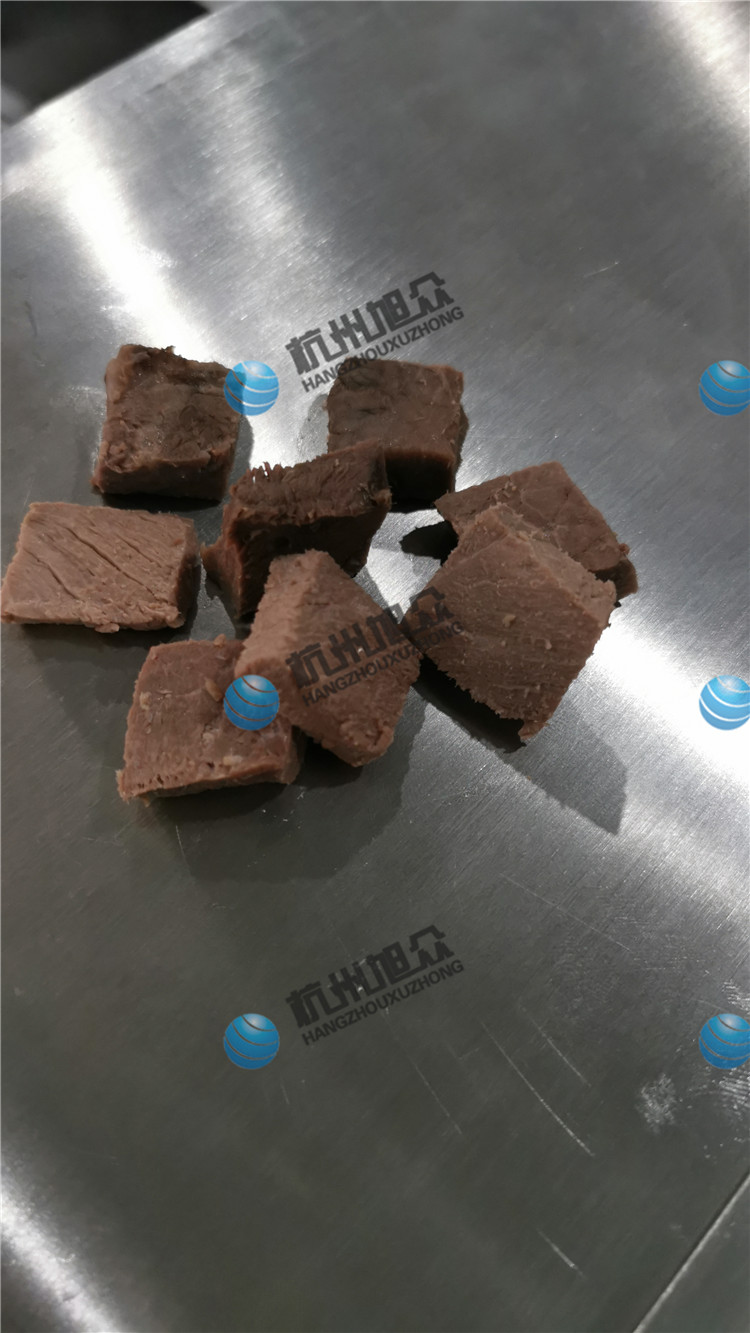 客戶自帶熟牛肉來現(xiàn)場試機(jī)——切丁機(jī)