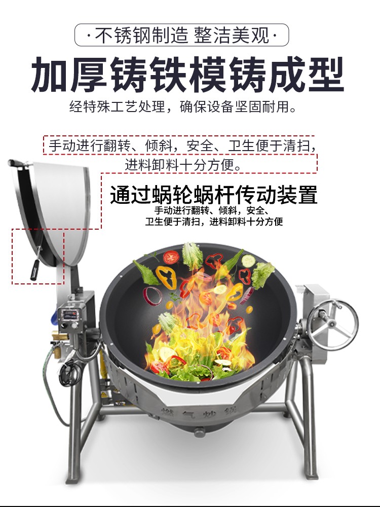 3、鍋體通過(guò)蝸輪蝸桿傳動(dòng)裝置,手動(dòng)進(jìn)行翻轉(zhuǎn)、傾斜,安全、衛(wèi)生便于清掃,進(jìn)料卸料十分方便。?