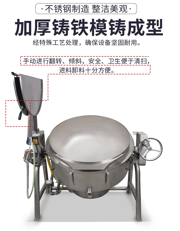 1、本設(shè)備為可傾式燃?xì)鉁仯溴伾砜梢詢A復(fù),以倒出鍋內(nèi)物料。
